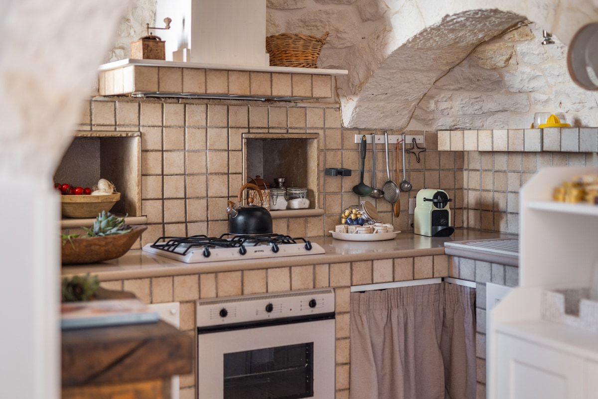 Renovirani trulo na mirnoj lokaciji na selu sa autentičnim stilom, većina enterijera je reciklirana ili stari namještaj preuređen na moderno funkcionalan način. Ima 1 dvokrevetnu spavaću sobu i 1 kauč u dnevnom boravku. Novouređeno kupatilo sa tušem,potpuno opremljenu kuhinju, mašinu za pranje veša i mnogo prostora na otvorenom (jedna terasa kojoj se može pristupiti iz spavaće sobe i jedna sa druge strane sa roštiljem Pristup bazenu dijeli se sa gostima druga 2 objekta (bez spoljašnjeg)
