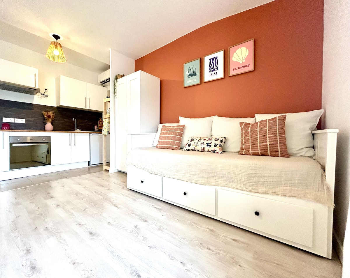 Počastite se nezaboravnim smještajem u ovom elegantnom romantičnom apartmanu Savršen za romantičan boravak, ovaj smještaj je osmišljen da kombinuje šarm, udobnost i opuštanje. ✨<B>Ovo će vam se svidjeti</B>: Hidromasažna kada s 🛁 2 sjedišta za opuštajuće trenutke 🍽️ Potpuno opremljena kuhinja Bračni krevet 🛏️ (180x200) 2mx2m Idealna 📍 lokacija u srcu La Londe 2 koraka od prodavnica, restorana i živahnog centra 🌊 Samo 10 minuta od plaža Argencijera i 15 minuta od Lubea i Pelegrina