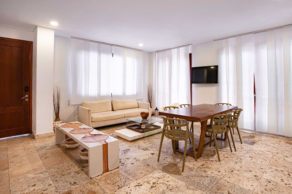 Imagina despertar con el sonido del mar y la brisa cálida de Cartagena. Este apartamento ha sido diseñado para que te sientas en casa desde el primer momento. Acogedor y funcional, es una excelente opción para quienes visitan la ciudad por congresos, trabajo remoto o simplemente para desconectar con amigos o en familia. Se encuentra justo al lado del Hotel Hilton Cartagena, en una de las zonas más privilegiadas de El Laguito. NOTA: el registro cuesta 50.000 NO incluido en la tarifa de Airbnb.