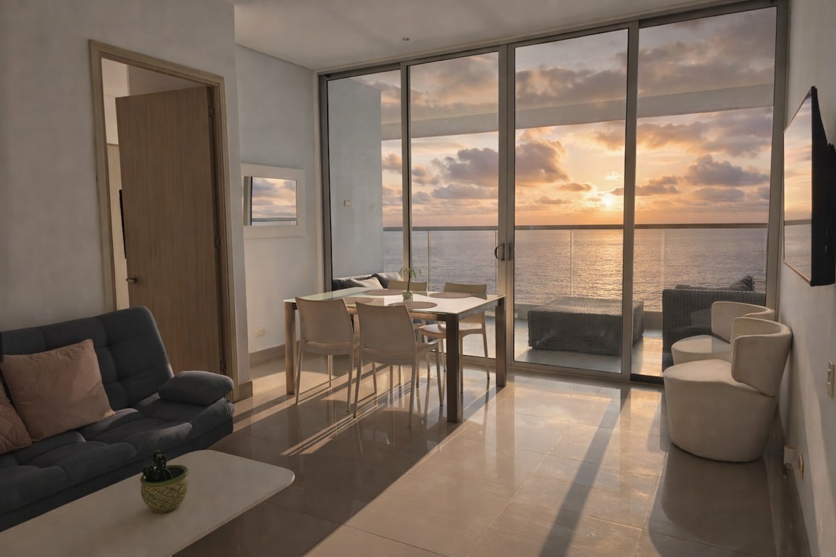 36th floor apartment with direct ocean view and stunning sunsets from the balcony. Modern, comfortable space with strong AC in all areas. Located in Bocagrande, a prime tourist area, close to beaches, restaurants and supermarkets. ⚠️ Lively area, occasional noise possible. Perfect for travelers who value views, location and a city experience. Easy check-in and fast host support.