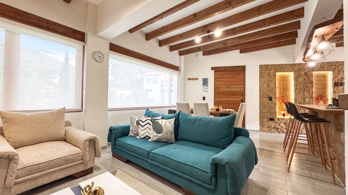 Importante: Se alquila para grupos de 5 a 6 personas para Festival de cometas y luces, Navidad y Año nuevo. FAVOR solicitar la reserva con el número TOTAL de huéspedes. Hermoso apartamento con una ubicación privilegiada, frente a un lindo parque donde podrás disfrutar del sol y el canto de los pájaros. Excelente para pasar un fin de semana en Villa de Leyva de la forma más cómoda y acogedora, en familia o amigos en uno de los pueblos más tradicionales de Colombia.