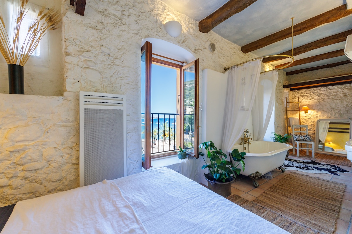Half way from Nice and Monaco, in Eze pedestrian medieval village charming suite in a XVI centuty small house with a roof terrace overlooking the mediterranean sea . Living and sitting room with fireplace on the first level, then the bedroom and a semi opened bathroom with a lighted bath and shower. A magic and romantic accommodation right in the middle of the old village of Eze famous for its hand craft its art galleries, its restaurants and the exotic garden at the top. An amazing view !!!