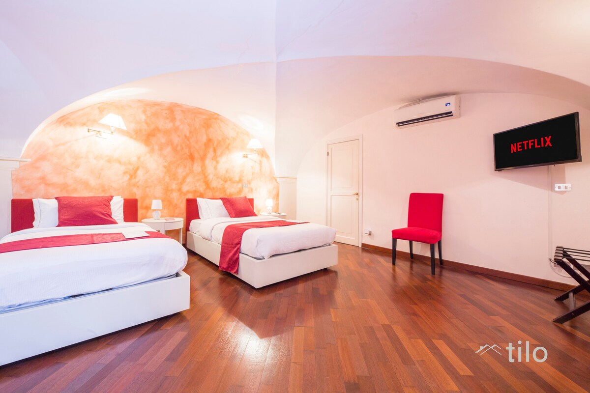 Situato in un magnifico palazzo del '500 questo grande appartamento con ampia terrazza può ospitare fino a sei persone in due camere separate e due divani letto singoli nel soggiorno. L'appartamento è fornito inoltre di tutto il necessario per soggiorni di piacere o di lavoro. CITR:010025-CAV-0077