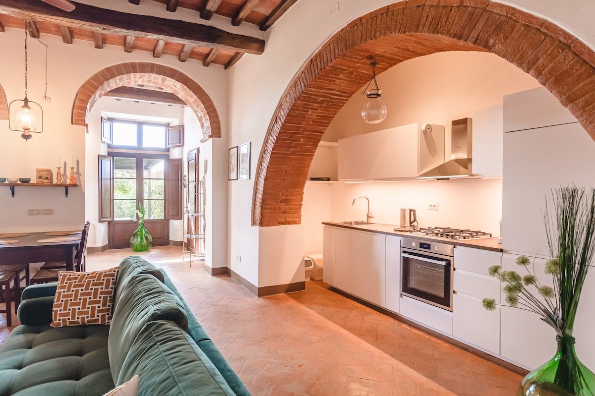 Vaše privatno toskansko utočište između Pience i Montepulćana. Prostran apartman od 100 m² za dve osobe, sa ekskluzivnim pristupom, velikom privatnom baštom i pogledom na brda Val d'Orcia koji oduzima dah. Elegancija, smirenost i autentičnost – samo vi… i Toskana.