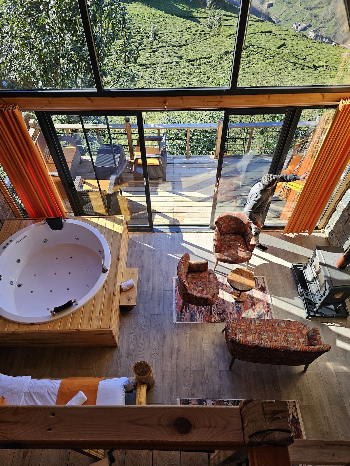 Pogled, pogled i pogled! Uživajte u jednom od najlepših pogleda u celom Hacvaliju, Mestiji. Mesto je privatno i mirno, a samo 50 metara od ski lifta Hacvali. Probudite se uz zvukove veverica, možda ugledate lisicu i divite se veličanstvenim vrhovima blizanaca Ušbe. Područje se redovno tretira protiv insekata, ali kako je okruženo netaknutom šumom, povremeno možete primetiti muvu ili malu bubu – deo pravog planinskog iskustva.