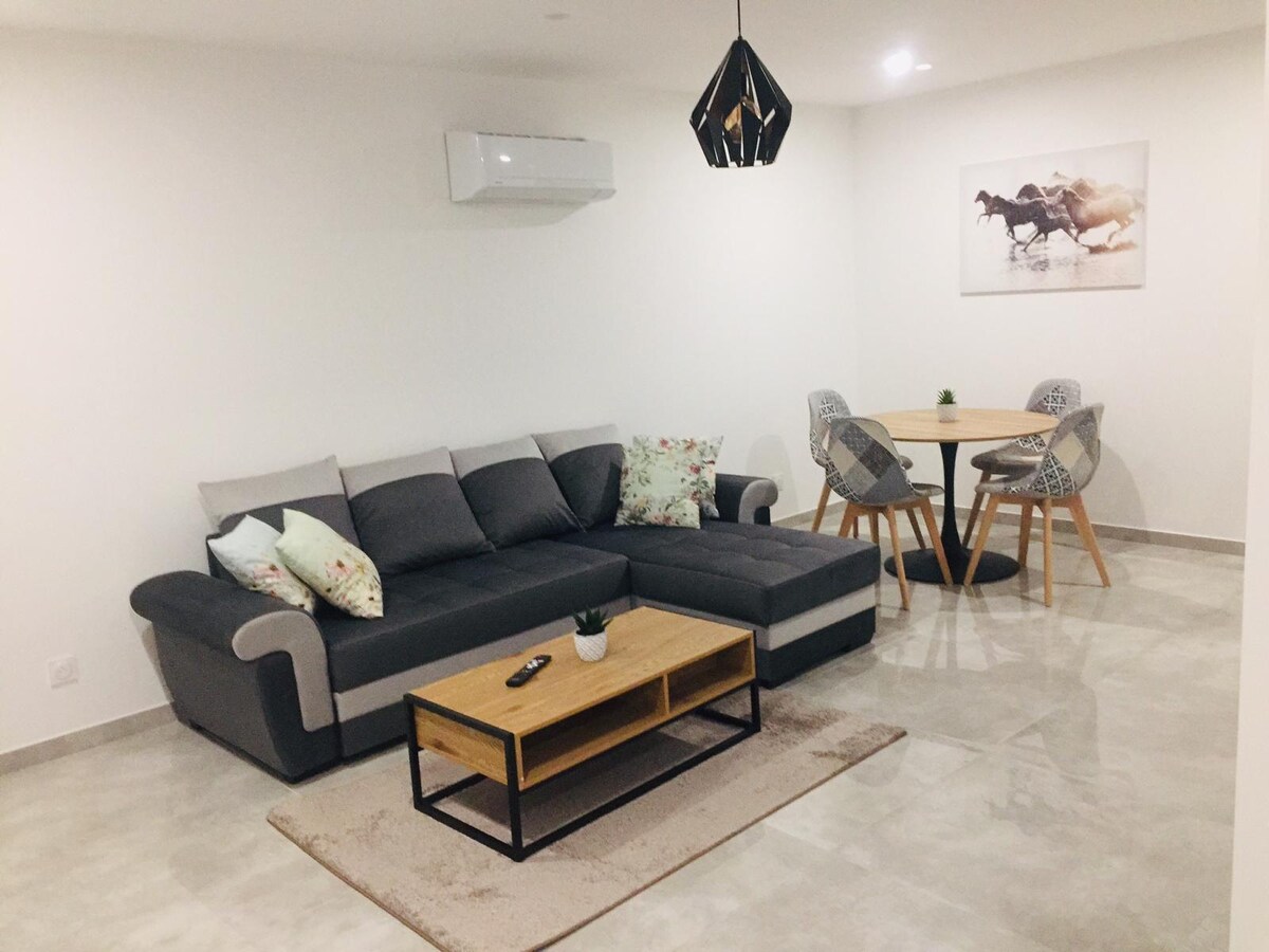 Dođite i uživajte u trenutku mira i odmora u našem stanu koji pruža pristup prijatnom dvorištu izgrađenom od suvog kamena, mirnom i neuglednom, idealnom za odmor od nekoliko dana ili više u Nimu i okolini. Smješten u srcu Nimske garige i nekoliko koraka od centra grada (10 minuta) sa brzim pristupom sa autoputa (5 minuta). 100 m dalje, u srcu borove šume, nalazi se teniski klub - veslački tenis, teretana, bazen i restoran
