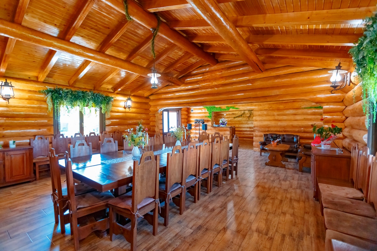 Alege să te relaxezi alături de prieteni într-un loc unic , cabana construită din lemn rotund fiind situată în sânul naturii . În apropiere se pot face drumeții sau se pot admira și hrăni cerbi , ciute și mistreți.