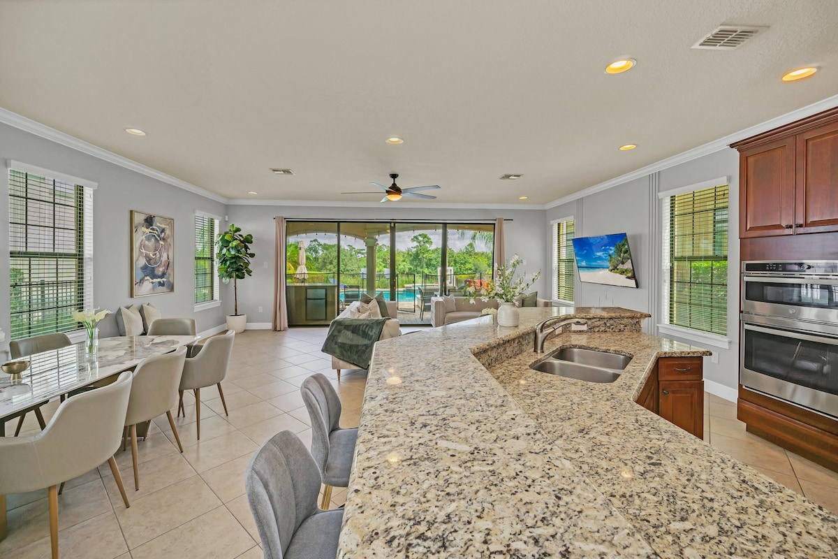 Elegantan dizajn, luksuzna udobnost i beskrajna zabava, sa prostranom terasom za bazen od 2200 stopa i kuhinjom na otvorenom, bez zadnjih komšija u prelijepoj šumi u zadivljujućem odmaralištu Reunion od 3,5 kvadratne milje. Imaćete sopstveni privatni bazen sa preljevnim spa centrom, bioskopom, bilijarom - igraonicom, 4 tematske sobe: SPOLJNI PROSTOR, MARVEL SUPERHEROJE sa TOBOGANOM, SMRZNUTE II, ORMAR HARIJA POTERA, PS5, u roku od nekoliko minuta do Diznija.