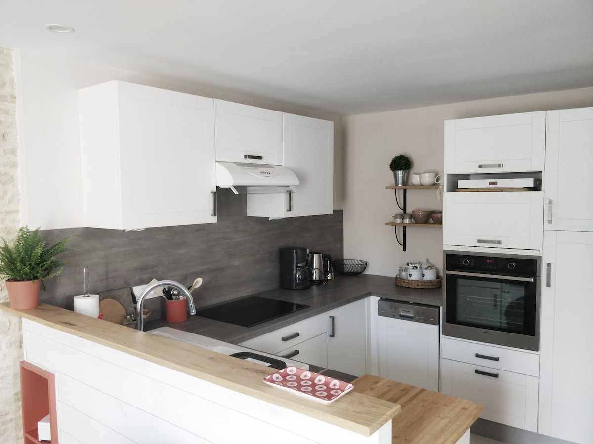 Uživajte u elegantnom, centralnom smeštaju u Poituu. Kuća u nizu sa neometanom terasom. Idealno se nalazi između Poitiersa i Niorta, 7 km od autoputa A10, izlaz 31 Lusignan. Jednostavan parking na ulici. Stanica za punjenje električnih vozila 200 m Vanjski prostor sa spa centrom za dobar dan razgledanja, Plancha Electric. Dve spavaće sobe sa krevetima u 140. Kvalitetan Wi-Fi. OBEZBEĐENA je posteljina za krevet i WC šolju ZA boravke OD 2 NOĆENJA.