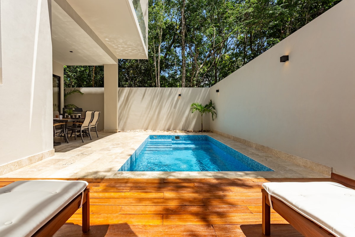 At Casa Okó, enjoy a spacious and comfortable home with your family. Its traditional Maya Chukum architecture, combined with rustic materials, creates unforgettable moments in one of the most exclusive areas of Mayakoba, with 24/7 security. Relax by the beautiful lake (or “cenote”) reserved for residents, surrounded by trails, parks, and lush jungle. Perfect for golfers, just steps from the famous El Camaleón Golf Course, and equipped with high-speed internet for your convenience 🏝️