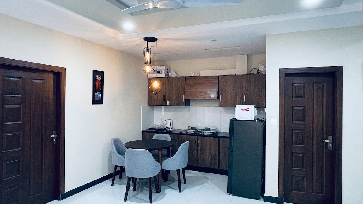 Udoban i elegantan jednosobni apartman sa samostalnom pametnom bravom, 60-inčnim TV-om i odličnom lokacijom, sa drvenim dekorom, savršen za udoban boravak. Uživajte u hlađenju i grejanju prostora i toploj vodi 24/7. Udobni kreveti, plišani kauči i Netfliks na 60-inčnom pametnom TV-u. Potpuno opremljena kuhinja sa frižiderom, rernom i grickalicama. Šah i luddo. Privatni balkon, samostalna prijava, privatni ulaz, direktan pristup liftu i besplatan parking. Blizu poznatih restorana i vrhunskih atrakcija kao što su džamija Fejsal, Monal, park F9 i Lejk Vju.