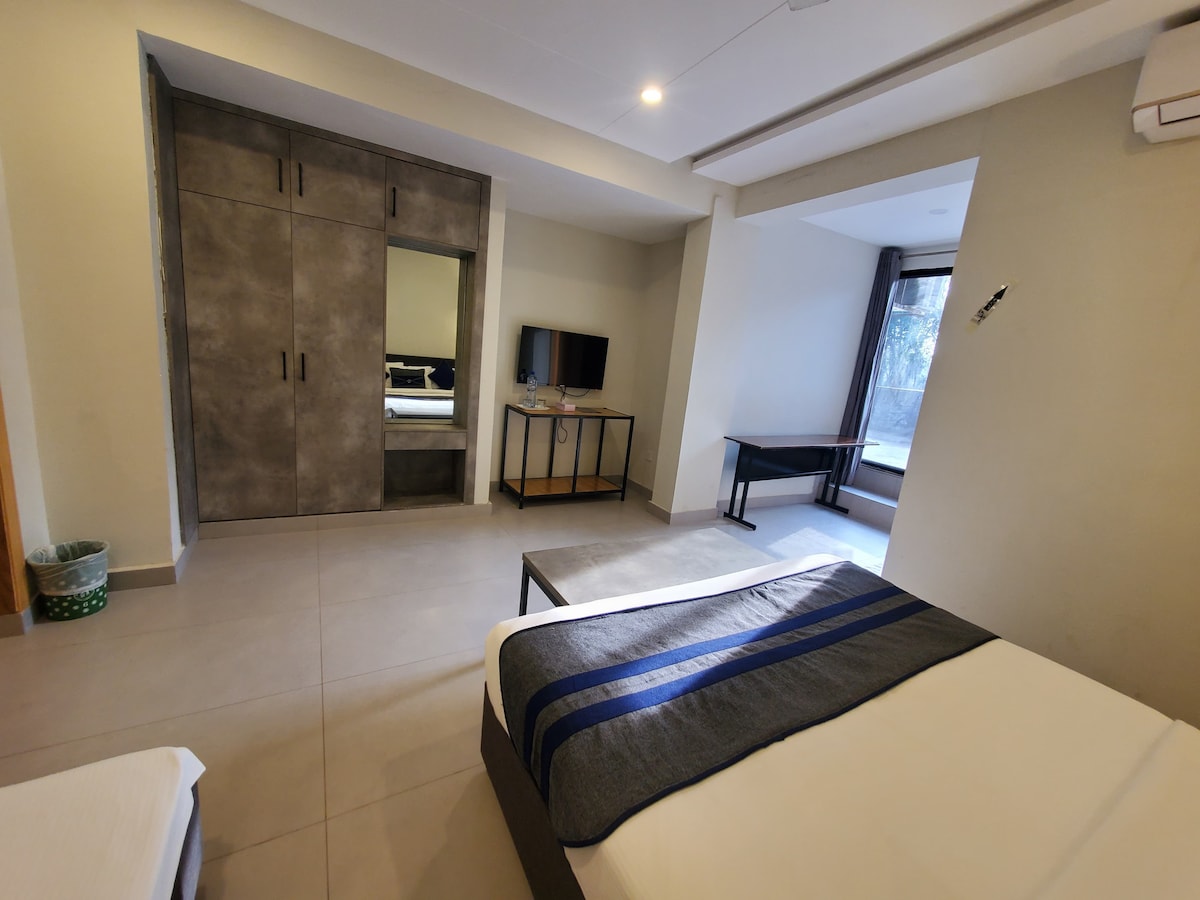 Cozy Budget Room | King Bed | Smart TV | Shared Kitchen & Terrace Stay in this stylish grey-themed budget room with a king-size bed, smart LED TV, and a two-seater sofa. Located on the ground floor for easy access, it includes free parking and a hot water geyser in the bathroom. Enjoy shared spaces like a dine-out terrace and a fully equipped kitchen. ❄ No AC, but well-ventilated with a fan. Book now for a comfy, affordable stay!
