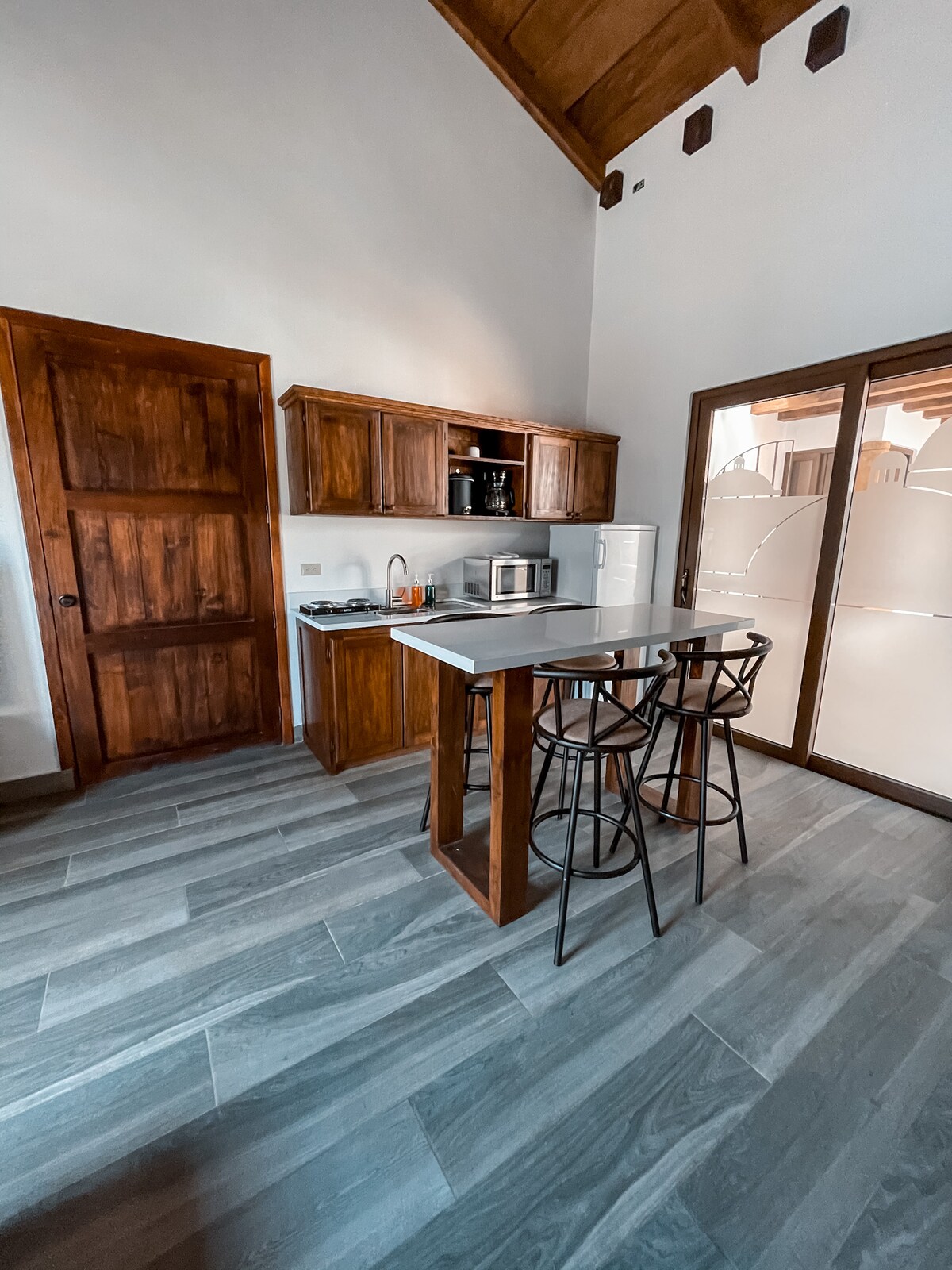 Ova živopisna, moderna kuća u stilu potkrovlja od 600 kvadratnih stopa ima neke od najspektakularnijih pogleda u Kostarici sa svoje privatne terase. Pažljivo uređen prostor ima bezbroj udobnosti i pažljivo je osmišljen s pažnjom posvećenom detaljima. Sve je potpuno novo i vrhunsko. Izuzetno brz WI-FI i radni sto pružaju idealnim putnicima koji rade. Potpuno opremljena kuhinja je precizno opremljena svime što vam je potrebno za dobru hranu tokom boravka. Čak i tuš-kabina ima spektakularan pogled.