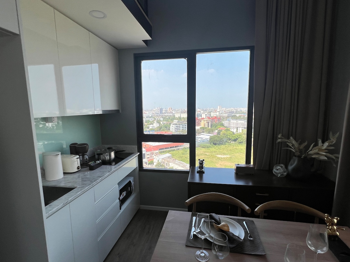 Enjoy a stylish stay@ centrally located condominium. The balcony faces to the University campus. All rooms has ceiling-to-floor window. Provide housekeeping, WiFi, smart TV, Pool & Sauna, Gym & Co-work space. Nearby is the Airport Link, BTS, MRT, Asok Pier & Train station ; Singha Mall, Terminal 21, 7-11, Starbucks, Tim Hortons, HealthLand, Coffee Club, Cafe Amazon, Lemon Farm, Thai, Japan & Korea dining, Clinic, Hospital, Church, SWU & night market. Click on Additional Photo for info.
