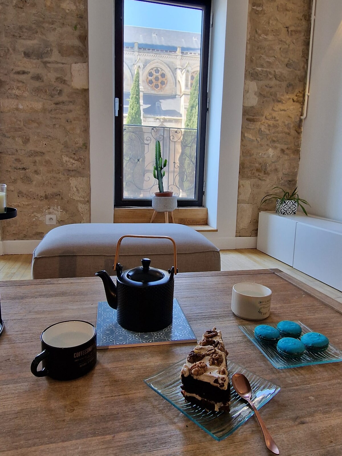 Goncourt42, c'est un appartement secret au cœur du passage où vécut Marc Bernard, Prix Goncourt 1942. L'appartement circule autour d'une terrasse ouverte sur une cour arborée, bercée par les cloches de St-Castor et le murmure des conversations d'un petit restaurant. Nous l'avons décoré à l'image de nos passions. La salle d'eau et la cuisine dernier cri se conjuguent avec des objets chinés. A votre disposition, un bureau calme, des transats pour siester et la foule de commerces de l'Ecusson. Clim