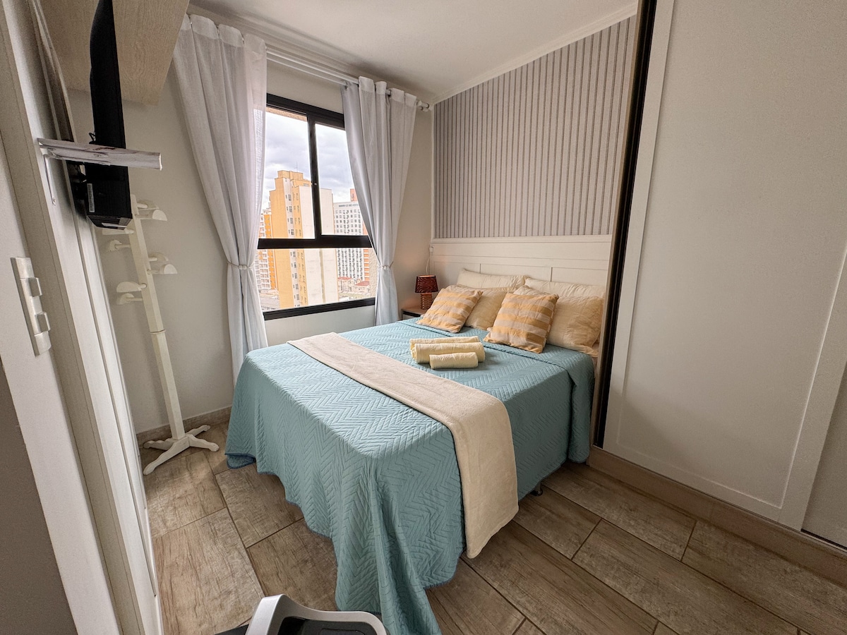 Moderan studio apartman u Rebouçasu, 5 minuta od Mercado Municipal, Shopping Estação i u blizini kafića i barova. Jednostavan pristup: 10 minuta do autobuske stanice, 25 minuta do aerodroma. Klima + grejanje; gasni tuš; zajednički radni prostor; 400 Mb Wi‑Fi + radni sto; francuski krevet sa hotelskom posteljinom + zavese za zamračenje; opremljena kuhinja; pametni TV sa strimingom; samostalna prijava 24 sata; vešernica i teretana u zgradi.