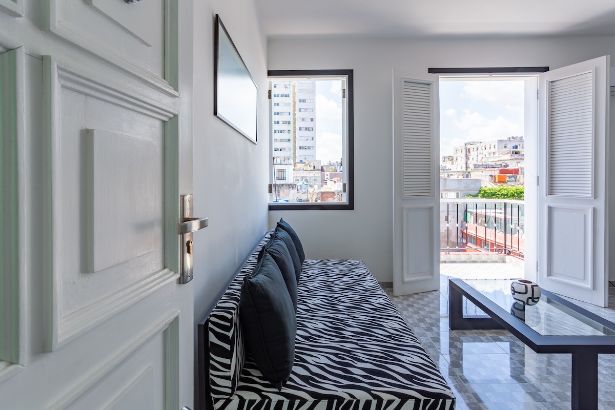 Apto se nalazi u centru Vedada, jednog od najmodernijih područja grada. Potpuno nezavisan, renoviran sa puno strasti zadržavajući stari dio objekta, koristeći elemente i detalje modernosti, sa svježim okruženjima, provjetrenom, sjajnom sobom i odličnom udobnošću čineći jedinstven doživljaj. Okruženi odličnim mjestima za posjetu, restoranima, barovima, noćnim klubovima, nekoliko minuta od Plaza de la Revolucion, Malecón, Hotel Nacional i oko 30 od aerodroma. Wi-Fi non-stop