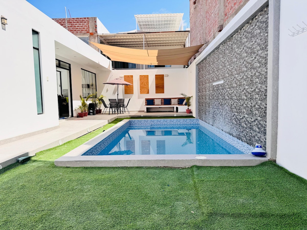 Casa de estreno ubicada a 10 minutos a pie de la plaza de Camaná cerca a restaurantes, Farmacias, bares, mercados, tiendas, etc La Sala cuenta con sofás muy cómodos y modernos, equipo de sonido, Smart TV con todas las aplicaciones para ver series y películas, control de tv por voz, diferentes juegos de mesa Cocina completamente equipada con refrigeradora, cocina, horno, arrocera, licuadora Área libre con piscina y espacio para relajarte 2 Habitaciones amplias con ventiladores y armarios