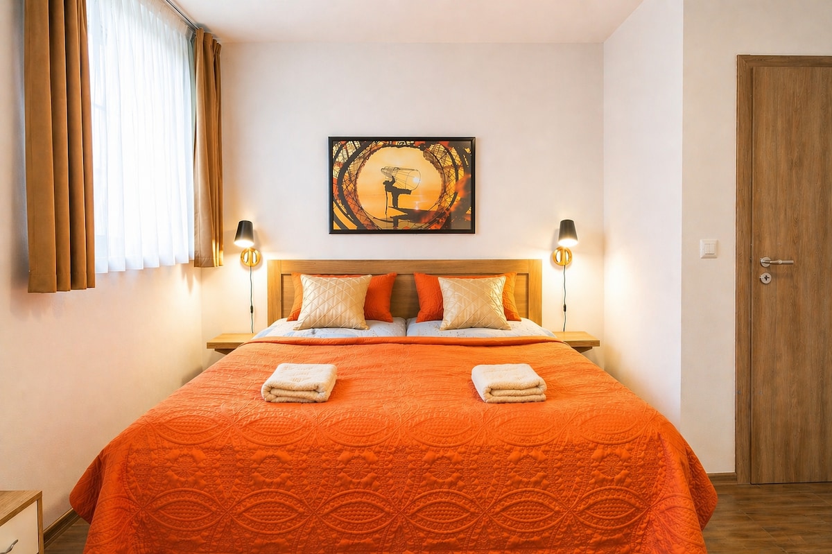 Naš privatni i udobni apartman spaja šarm starog sveta sa osnovnim sadržajima, nudeći autentičan ugođaj života u ovom bajkovitom gradu na obali reke. Iz naše bašte možete da vidite dabrove koji obavljaju svoje večernje aktivnosti, čaplje koje love ribu na plićaku i vodene ptice koje veslaju nizvodno i uzvodno. Ova petsto godina stara kuća zadržala je svoj tradicionalni karakter sa originalnim arhitektonskim detaljima i debelim kamenim zidovima, dok pažljivo osmišljene izmene obezbeđuju savremenu udobnost.