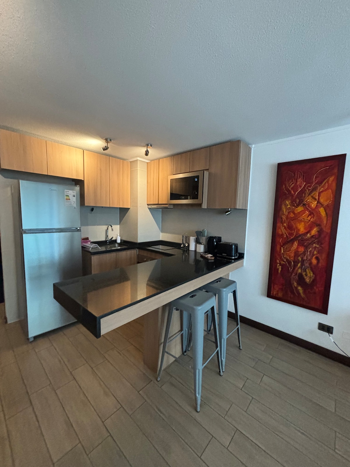 Studio apartman, miran u Comuna de las Condes, na korak od Clínica las Condes, mali restoran, supermarket, laboratorija, komercijalne prodavnice, u blizini tržnog centra Alto las Condes. Samo za 3 osobe, ima podzemni parking. Ima frižider, mikrotalasnu rernu, rernu, aparat za kafu, kuvalo za vodu, toster, toster, posuđe, veš koji se plaća, pametni TV od 43inča,mašinu za pranje/sušenje veša Bazen, klima-uređaj, opustite se u ovom mirnom i elegantnom prostoru.