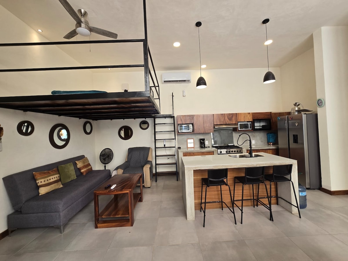 Disfrute de este acogedor estudio nuevo, perfectamente ubicado a solo 60 metros de la playa. Cuenta con cama King Size, Smart TV, Internet, baño privado y cocina equipada para su comodidad. Como huésped, tendrá acceso a la alberca común. La capacidad máxima es para 2 personas. El estacionamiento es disponible en la calle. Perfecto para una escapada relajante cerca del mar.
