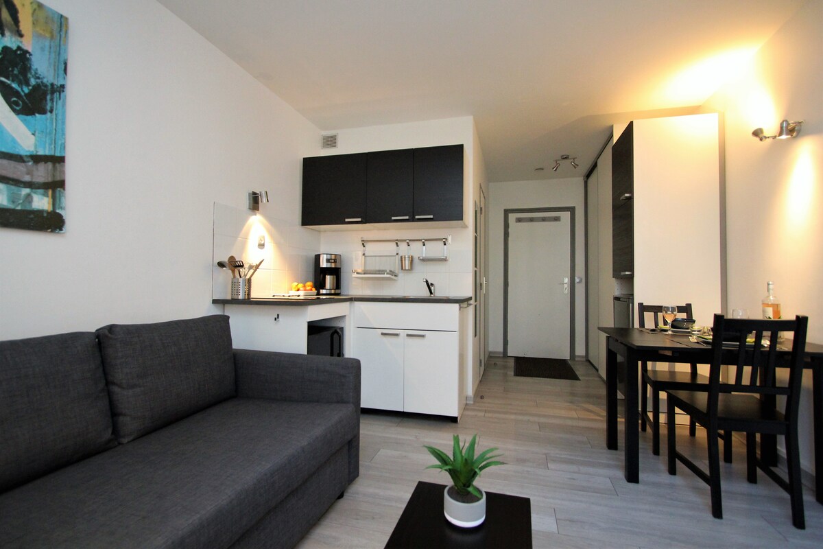 Svijetli stan od 30 m2 za 2, 3 ili 4 osobe. Zasebna mala spavaća soba sa bračnim krevetom i dnevni boravak sa 2 kauča na razvlačenje. Jasan pogled na Brevent. Vrlo funkcionalan stan renoviran sa pažnjom, prozori sa dvostrukim staklom, udaljen 2 minuta hoda od pešačke ulice. WI-FI, pametni TV, Chromecast, mali balkon sa stolom i 2 stolice.