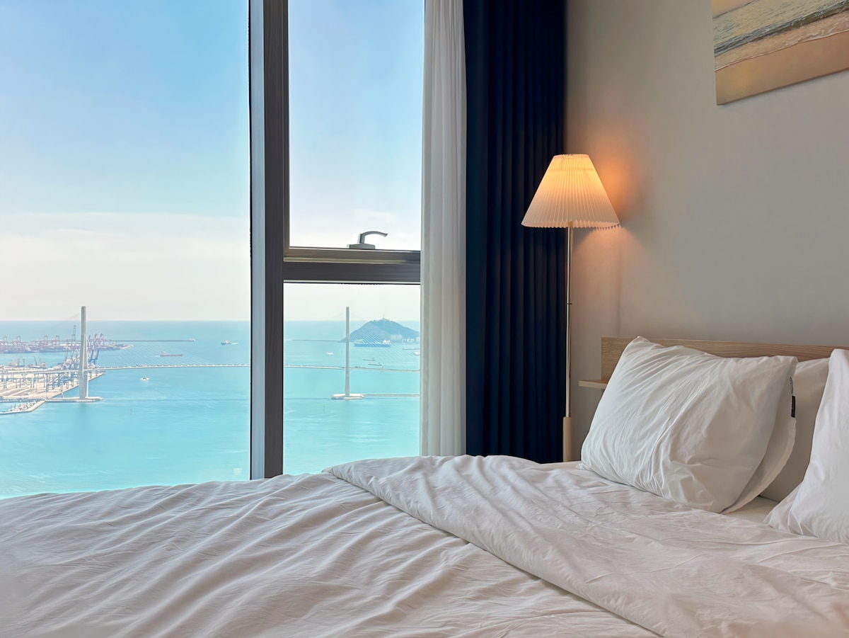 @stay8usanhang is a space overlooking Busan Port, thoughtfully designed to offer comfort and inspiration. Every detail, from music and fragrance to ambiance, interior, and bedding, has been carefully curated to enhance your stay. -Sky bridge connected to Busan Station (5-minute walk) -1 Super King bed, 3 Super Single beds Ocean-view bathtub (spa-ready) - Fully equipped / ideal for family travelers 50-inch large TV with Netflix, YouTube, OTT, and broadcast channels Bang & Olufsen speakers
