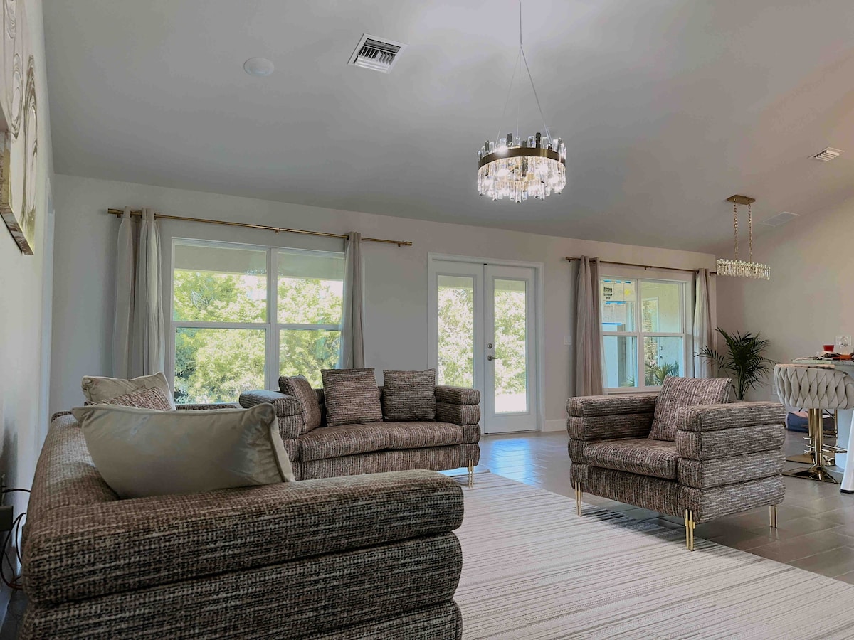 The living room has a 65 " smart TV,wall mounted with a LCD Fireplace below with surround sound- All TV's have Netflix.The bar room has a small refrigerator,pool table and dart board.Outside has a private lanai with Heated pool and a propane firepit.Enjoy the sonos sound with 55" smart TV in the Master bedroom the second bedroom also has a TV. The bar room,also has sonos as well as the lanai.30 minutes from several beaches.The garage will not be available.Home located in a quiet Cul de Sac