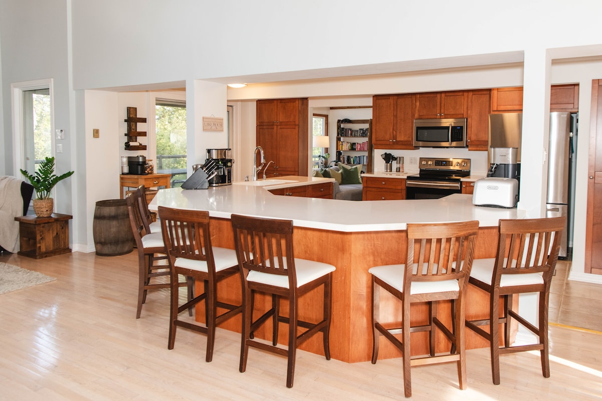 Uživajte u panoramskom pogledu na jezero Donji Bakhorn sa porodicom! Opustite se u hidromasažnoj kadi na vrhu stena Kanadskog štita, smeštenog među visokim borovima. Ova nedavno renovirana seoska kuća na obali ima 3 spavaće sobe i dnevni boravak otvorenog tipa. Preko 280 stopa obale za uživanje u izlasku i zalasku sunca i pecanje sa doka! Udobno se smestite na kauču, igrajte igre ili gledajte filmove. Prošetajte oko ostrva. Brzi Wi-Fi za rad ili igru. 6 minuta do grada, manje od 2 sata od GTA.