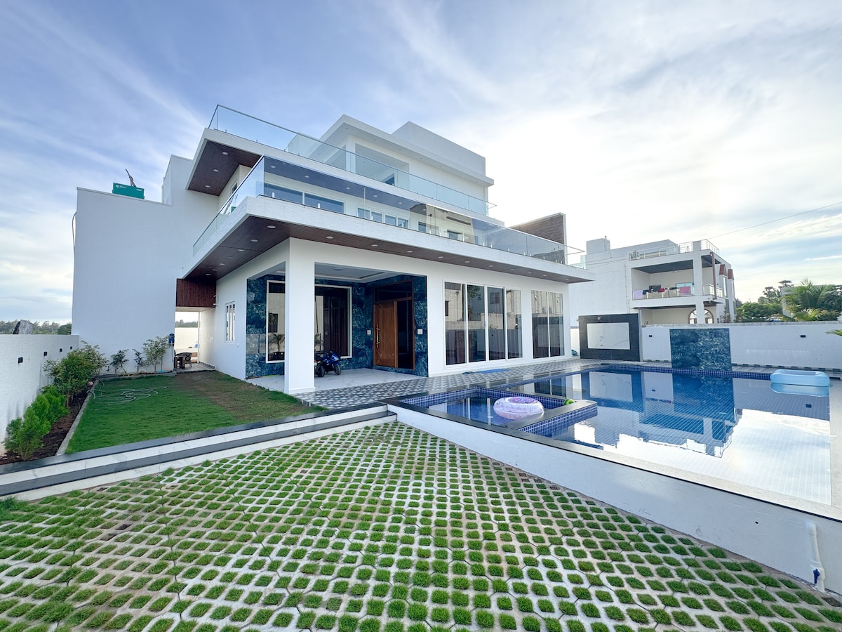 Dobro došli u naše prostrano 4BHK utočište! Uživajte u udobnom boravku sa 1 sobom sa klima-uređajem u prizemlju i 3 sobe sa klima-uređajem na prvom spratu, koje mogu da prime do 30 gostiju. Sa 6 kupatila sa grijalicama, velikom dvoranom za događaje i potpuno opremljenom kuhinjom. Uronite u naš bazen za odrasle (3-5 do 5,5 stopa) i bazen za djecu (2 stope) i iskoristite naš veliki travnjak sa sjedećom garniturom. Uživajte u igrama u zatvorenom i na otvorenom, roštilju i opciji za kućnog kuvara. Uz rezervno napajanje non-stop,Wi-Fi i dovoljno parkinga,