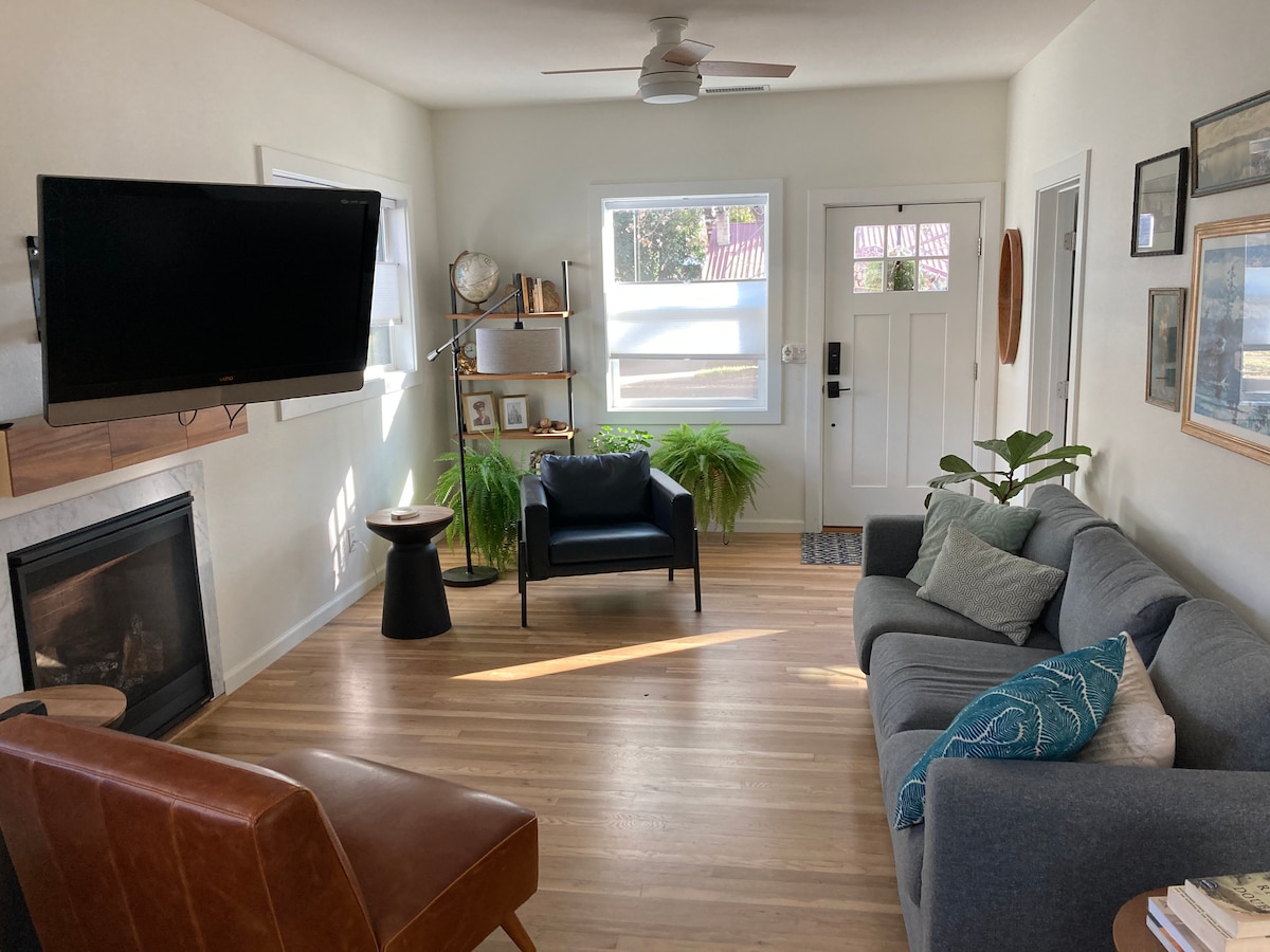 Experience a unique blend of history and style at the retro-chic apartment in the iconic Sherwood House. Fall in love with the 12 ft ceilings, bay windows, and hardwood floors that transport you back to 1883. The cozy 1-bedroom, 1-bathroom space is perfect for 2 guests, offering modern amenities like Wi-Fi, two TVs, and a fully-equipped kitchen. Immerse yourself in the heart of Chico, steps from CSU Chico, trendy restaurants, coffee shops, and vibrant farmers' markets just a short walk away.