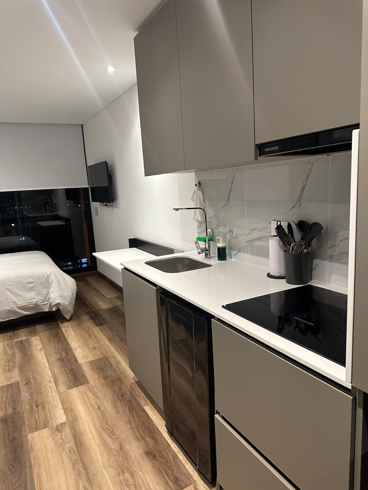 Enjoy a peaceful stay in this charming Bogota studio. It features a double bed and a foldable bed, a private bathroom with a dedicated walk-in shower, and a fully equipped open-plan kitchen to make you feel at home. Includes a private washer-dryer, a dining table for four, and all necessary utensils. Guests have access to premium common areas such as a coworking space, gym, dining zone, billiards, ping-pong, jacuzzi, and a beautiful event lounge. Just a few minutes’ walk from Parque 93