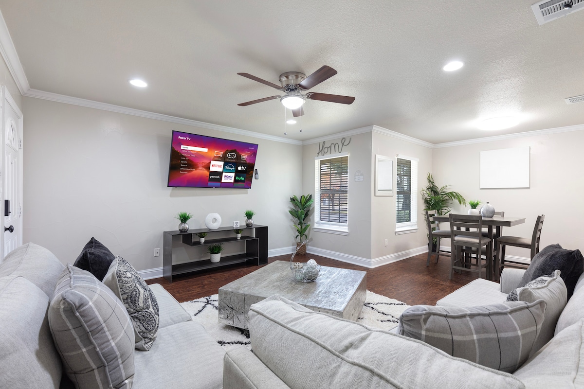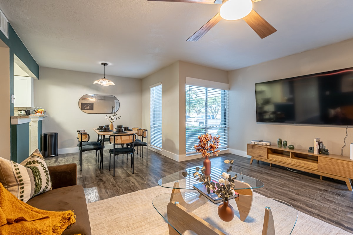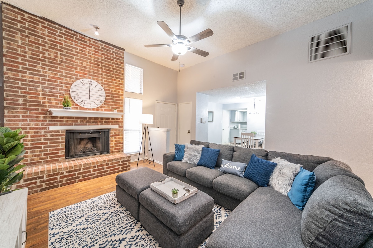Arlington man-cave se sastaje sa udobnošću 6 minuta hoda kroz park do AT&T stadiona, Globe Life Park ili Choctaw stadiona! Ne samo mesto za boravak, već i za igru! Pripremite igru bazena ili bacite pikado dok strimujete omiljene aplikacije na našem 65" 4k HDTV-u. Opustite se u stilu sa luksuznom posteljinom i peškirima, svaka soba sa sopstvenim televizorom ili uživajte u privatnom dvorištu sa igrama koje se gase. Stan u prizemlju sa BESPLATNIM parking mestom - nema vožnje ili taksija na dan utakmice je pravi bonus. 5 minuta vožnje do šest zastava i HH!