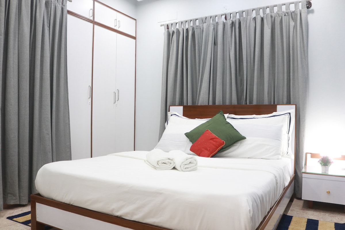 Welcome to our newly renovated, spacious 1-BHK flat, ideal for couples and families seeking comfort and convenience. The bedroom boasts a queen bed and soft orthopedic mattress for a restful night's sleep. Relax in the large living room with a 43-inch Smart TV, lightning-fast WiFi and dedicated workspace. Comes with a super clean bathroom stocked with essentials. The fully equipped kitchen includes basic ingredients, high-quality appliances, and crockery for your culinary adventures.