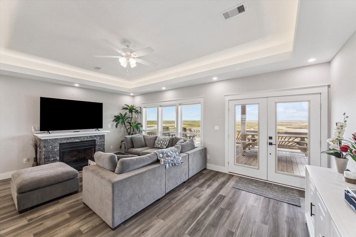 Relax with the whole family at this peaceful custom built home. Beach and bay views right on the canal. Fish right off the dock on the canal of Christmas Bay. The house is right across from County Beach entrance 4. There is a boat ramp available right across the canal as well. There are two suites with private bath! We have some of the best views of Sunrise and Sunset on the island. Inside our custom built home you will find beautiful details.
