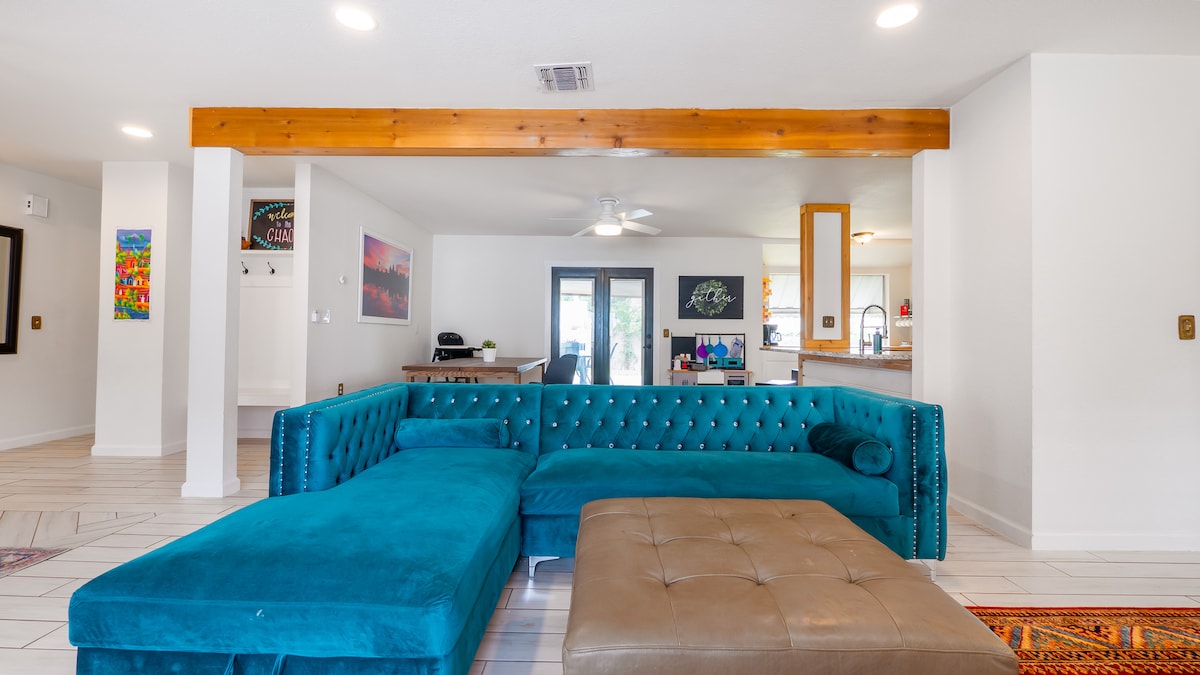 ⭐Dobro došli u Grass Hollow!⭐ Toplo utočište pogodno za porodice, gdje se djeca mogu igrati, kućni ljubimci su dobrodošli i gdje svi imaju prostora za opuštanje. 🌿 Zašto će vam se svidjeti boravak ovdje 🛏️ Bračni krevet (širine 180-220 cm) u primarnom 👶 Dječija soba sa krevetima na sprat i zidom za penjanje ☀️ Sunčano dvorište + velika natkrivena terasa 🐶 Pogodno za kućne ljubimce 🗓️ Savršeno za duže boravke 🚗 Garaža + prilaz za 2 automobila 🚶➡️ Može se pešačiti do parka Live Oak Smestite se u naš prijatan dom ispunjen modernom udobnošću i starinskim šarmom za porodice i mališane.