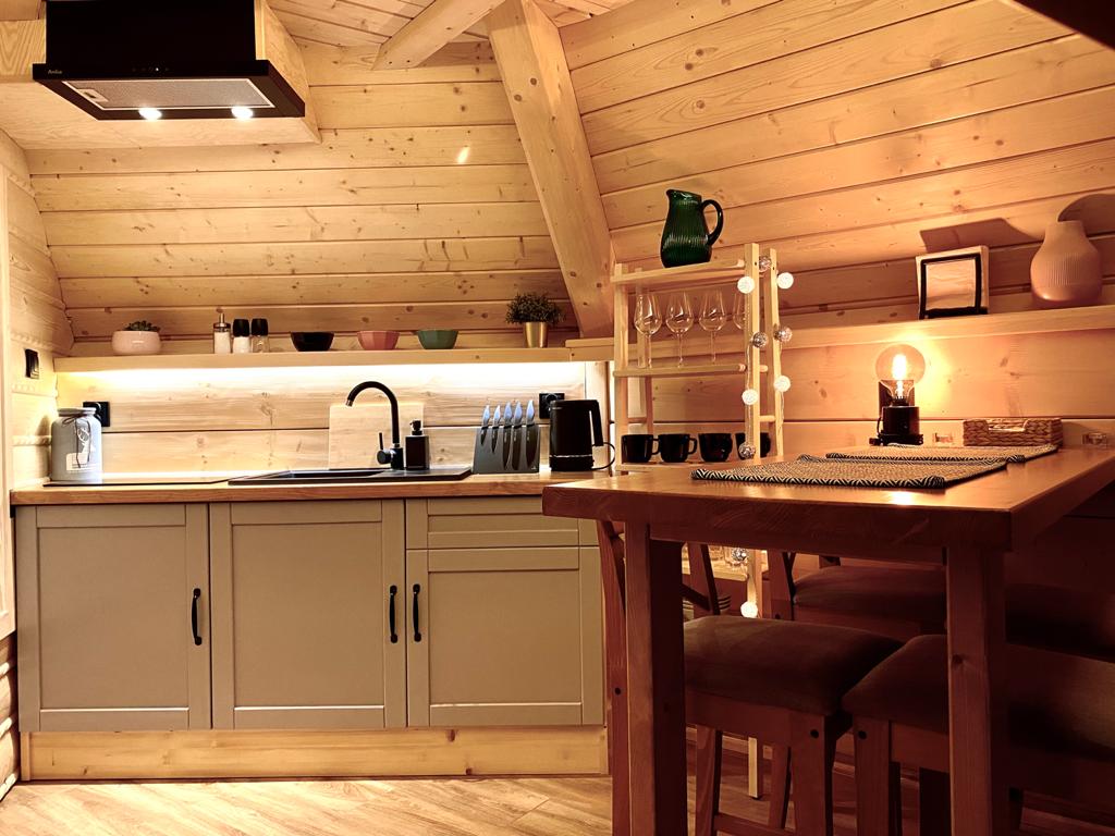 W Osadzie znajdą Państwo 5 domków typu Islandia z przeszklonym panoramicznym dachem. Do każdego z domków przynależy prywatna balia, taras z kompletem wypoczynkowym oraz grillem. Domki są w pełni wyposażone i posiadają osobny dostęp do sieci Wi-Fi, co umożliwi Państwu połączenie wypoczynku z pracą zdalną. Każdy z domków posiada przestronny salon z kominkiem oraz antresola, z której w ciągu dnia mogą Państwo podziwiać panoramę gór, z kolei nocą niebo pełne gwiazd.