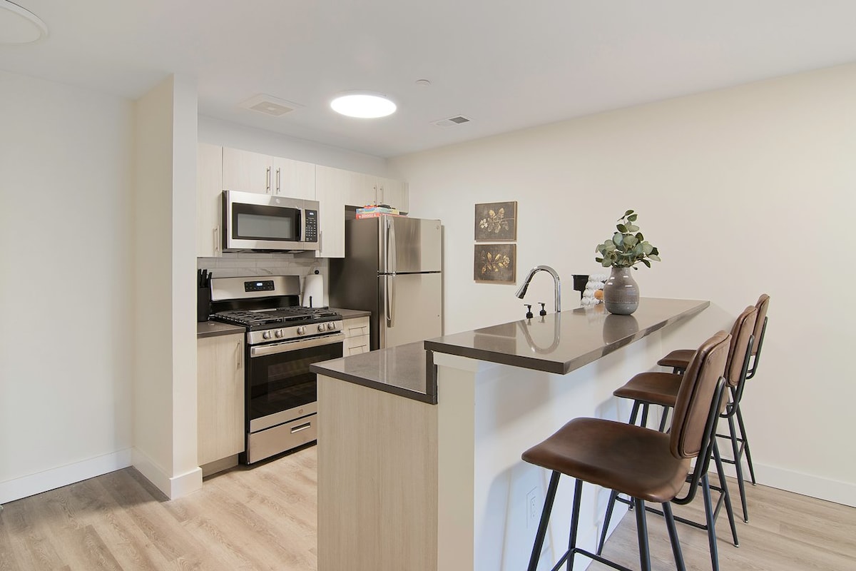 Dobro došli u potpuno novi moderan jednosobni stan, samo 1 blok od voza za Njujork, koji stiže na Menhetn za 30 minuta. Idealno za parove, poslovne putnike i posetioce Njujorka koji traže udobnost van grada. • Pešačenje do stanice za voz za Njujork • Aerodrom Njuark – 15 minuta •Besplatan parking u zatvorenom prostoru • Potpuno novi stan sa modernim završnim obradama •Teretana, salon (pogodan za rad), spoljašnji popločani deo i roštilj • hrana/restorani/tržnice u blizini •Potpuno opremljena kuhinja, zavese za zamračivanje • veliki bračni krevet na razvlačenje •Bezbedna zgrada – jednostavan samouslužni ulazak