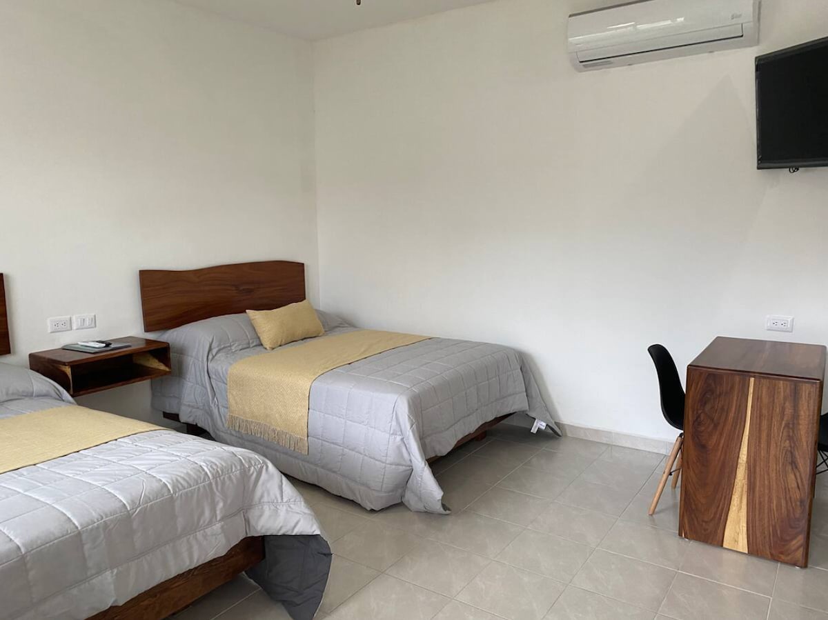 Habitación con 1 cama matrimonial y 2 individuales, contamos con colchones extras en caso de requerirse para una persona más, 1 baño con regadera, agua caliente y fría, wifi, TV Roku, cafetera, espacio al exterior para que puedan realizar una carne asada. Esta habitación turística se encuentra dentro de una privada con 5 habitaciones turísticas independientes en zona segura. Barra/cocina exterior compartida.