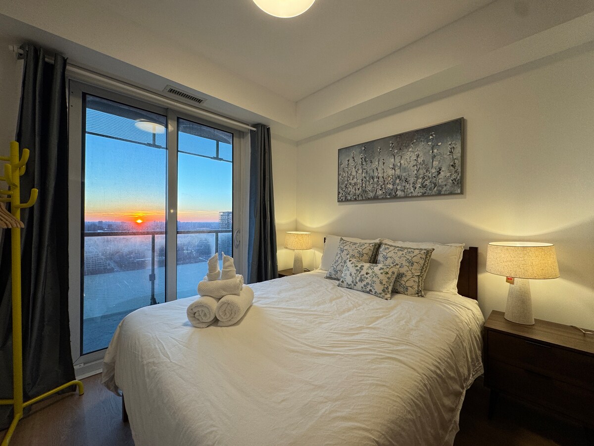 Mirna luksuzna garsonjera sa 2 spavaće sobe u srcu Toronta sa prelepim pogledom na CN toranj. Idealno za poslovne putnike, događaje i duže boravke. Uživajte u direktnom pristupu stanici Junion, prodavnicama, kafićima, prodavnici pića LCBO, restoranima i areni Scotiabank preko unutrašnjeg prolaza – savršeno za zimu. Stan ima brz Wi-Fi, TV od 85 inča, kompletnu kuhinju, vešernicu u sklopu apartmana, kao i sadržaje u zgradi, uključujući bazen, saunu, đakuzi i teretanu.