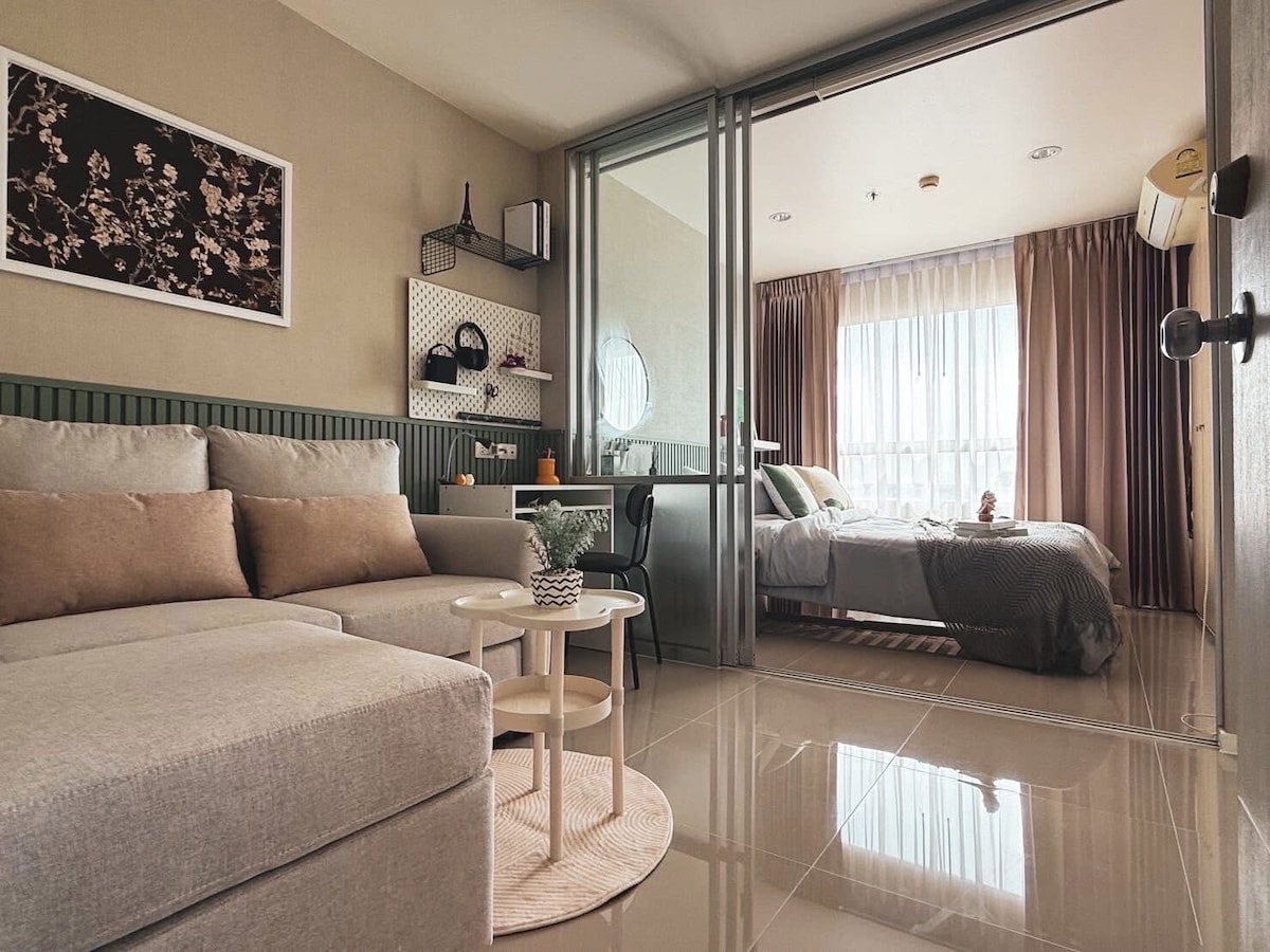 欢迎入住芭提雅中天海滩旁的七海一期公寓! 公寓位于宁静与便利兼具的中天区,步行约10分钟即可抵达绵软的沙滩与海景。这里不仅是住处,更是一个沉浸式度假体验空间——小区以精心设计的多主题泳池群为核心,多个泳池如蓝宝石般串联环绕,搭配水景设施,仿佛入住专属水上乐园。您还可免费使用健身房、桑拿房,在旅途中保持活力与放松。 这套精心布置的奶油风温馨开间,以柔和的色调与舒适的氛围,为您提供旅途中的理想休憩所。房间配置齐全: · 卧室区配备一张舒适双人大床,床品柔软亲肤; · 独立卫生间干湿分离,24小时热水供应; · 开放式小厨房设施完整:冰箱、微波炉、电磁炉、基础厨具餐具一应俱全,可轻松制作简餐; · 日常用品如一次性牙刷、拖鞋、纸巾、洗衣液等均已备好,入住无忧; · 阳台设有洗衣机与可升降晾衣架,十分便利。窗外视野开阔——近处是郁郁葱葱的绿化带,远处可眺望一抹海天一色,晨昏皆景。 这里既拥有公寓生活的便捷与私密,又承载着度假村的休闲与浪漫。无论是情侣出游、小家庭度假还是好友结伴,都能在此找到舒适与欢愉。 期待为您在芭提雅的海滨时光,增添一份安心与美好!