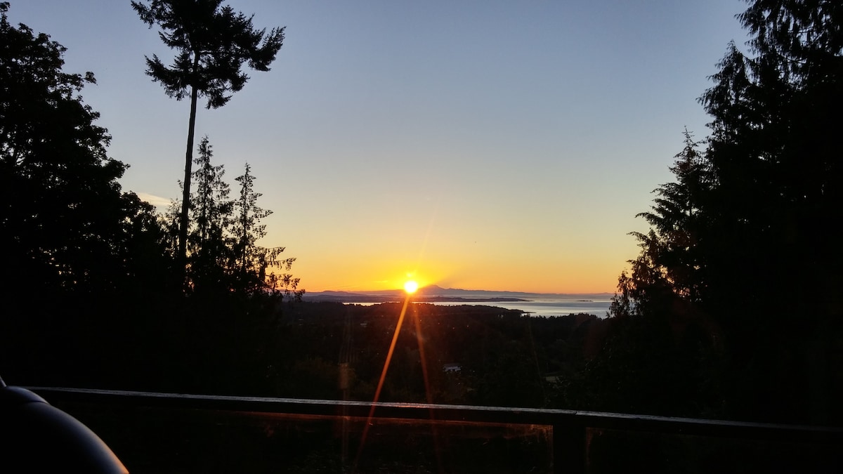 Come enjoy a romantic get-away with a PRIVATE - 3 person HOT TUB and gorgeous view. *GAS FIRE PIT with couch and loungers *BATHROBES & SPA TOWELS *FULLY stocked kitchen *In-suite laundry *Super fast EV Charger WALMART, SUPERSTORE & RESTAURANTS all within a 5 min drive *25 minute drive to Downtown Victoria We are a family of 4 working professionals that live upstairs. You will hear footsteps upstairs but we are very respectful when we have guests. **NO PARTIES or Other Guests allowed