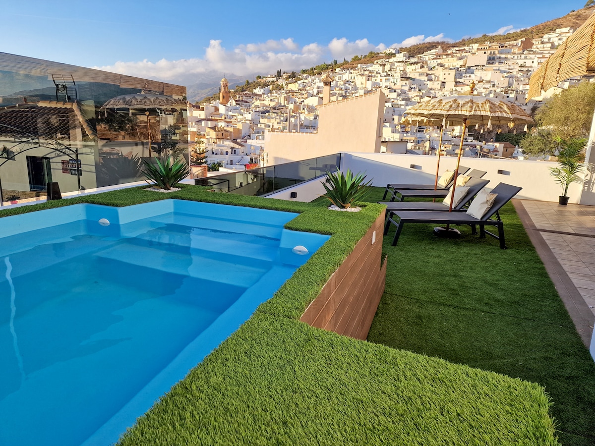 What stands out about this home is the private roof terrace with panoramic views and a private pool with sun loungers. The apartment (60m²) is completely new; perfect for a romantic getaway for two. It has a bedroom, a bathroom and an equipped kitchen. From the living room there is access to another terrace/balcony, from which you can enjoy wonderful mountain views. There is free parking in the street and it is just a ten-minute walk to the centre of Frigiliana; Nerja is a 10-minute drive away.