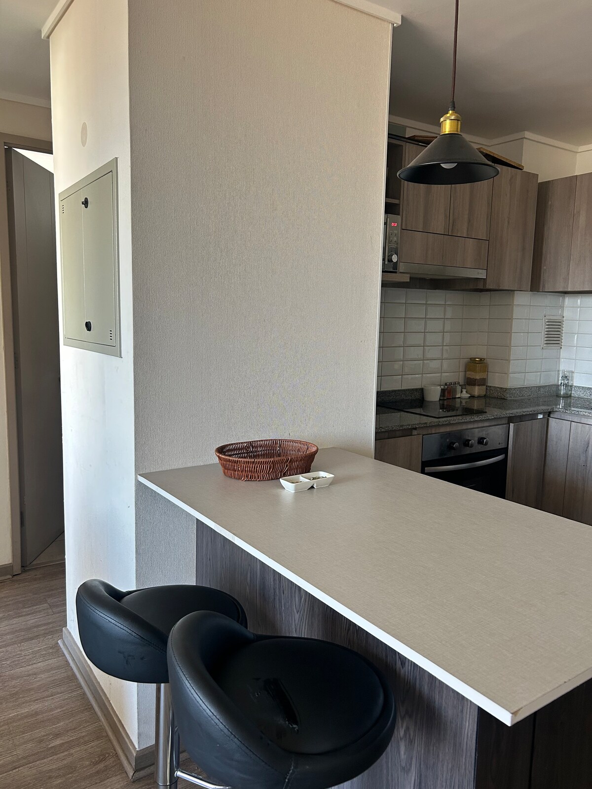 Cómodo departamento con ubicación a pasos de la ruta internacional, a cinco minutos del centro de la ciudad ( en vehículo) , cercano a clínica y a supermercados. Posee 2 dormitorios, 1 baño, cocina amoblada y equipada con todo lo necesario , lavadora, aire acondicionado y WiFi. Departamento ubicado en primer piso, estacionamiento gratuito dentro del condominio. Acceso controlado al condominio.