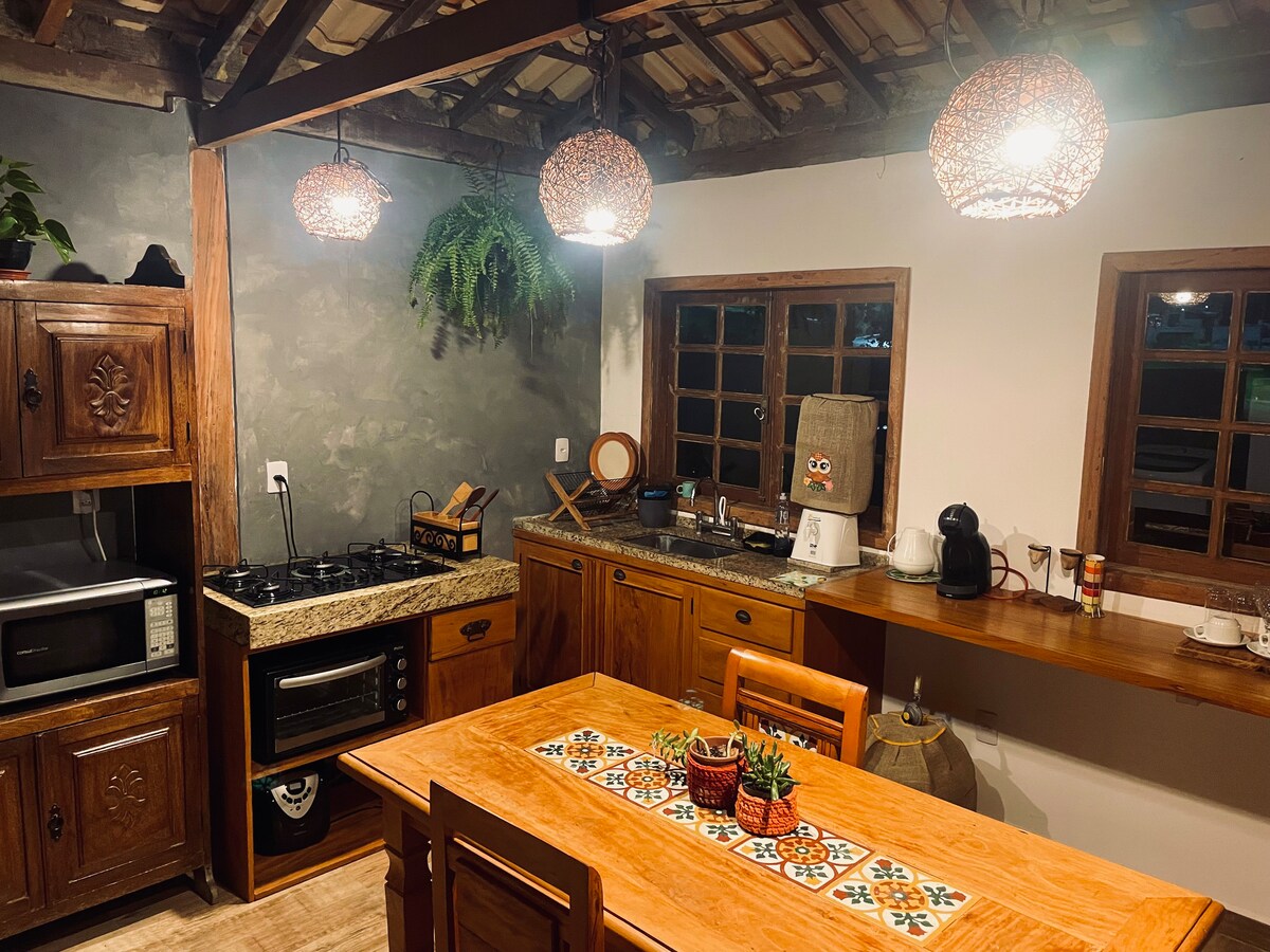 🌿Kolonijalna kuća u podnožju planine Sera de Sao Žoze 1800 m (5 minuta automobilom) od centra Idealno za parove i male porodice. 2 udobne dvokrevetne spavaće sobe (1 sa kupatilom) Kupatilo za druženje Kuhinja opremljena industrijskim ostrvskim šporetom, šporetom na drva Kamin Smart TV Brzi Wi-Fi Mašina za pranje i sušenje veša, roštilj Spoljašnji Chuveirão Riacho particular Privatni parking Organic Hortinha Dođite i doživite pravi Tiradentes u objektu Casa do Ciacho. Superdomaćin sa 5 zvezdica.