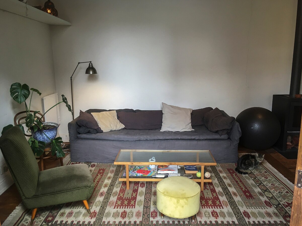 The house is warm and harmonious. The decoration combines Art Deco style with recycled wood and stylish furniture, creating a unique and charming atmosphere. You will find everything you need to be happy at home! It offers WiFi, a cozy gas heater in the living room, Smart TV, heating panels in the rooms and bathroom, a fully equipped kitchen, microwave, toaster, coffee makers, air conditioning in the main bedroom, and both floor and ceiling fans.