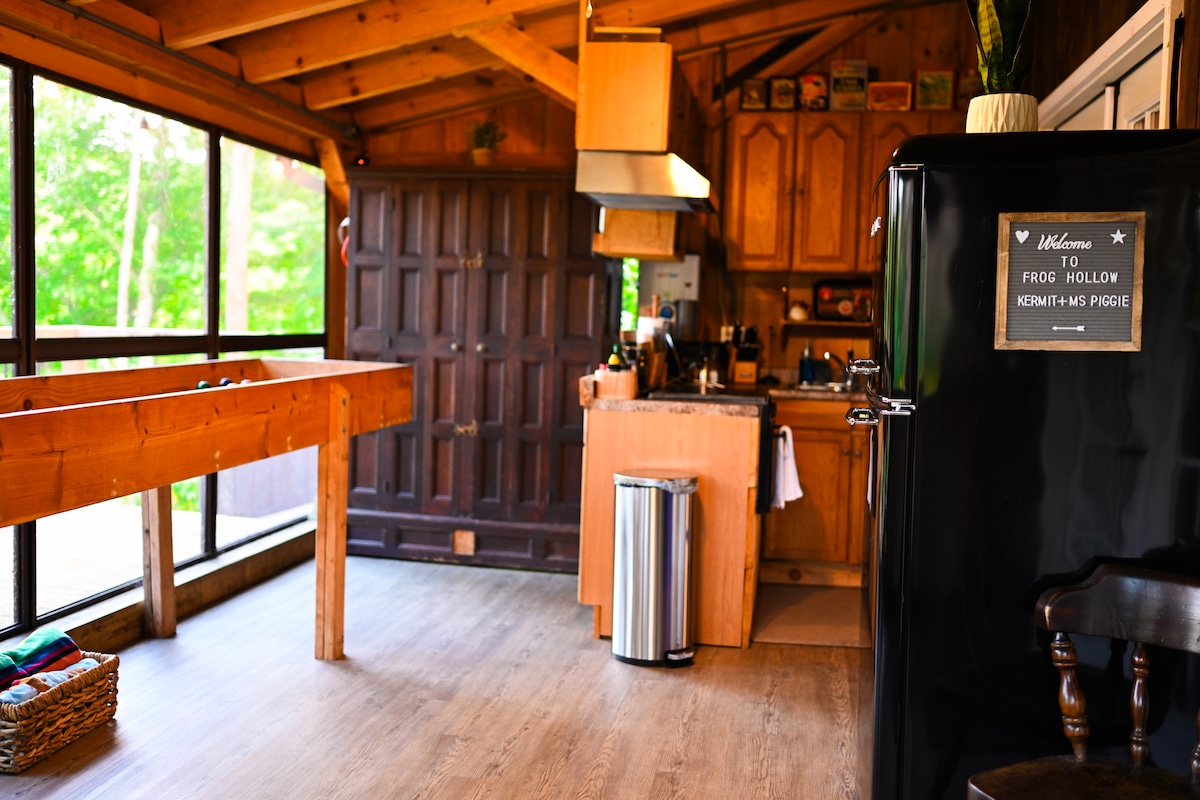 Skrovita, romantična, rustikalna brvnara pored francuske reke - Frog Hollow je savršeno mesto da pobegnete i doživite luksuz saune na drva i šumskih kupatila. Nalazi se u mirnom uglu CT-a, opustite se dok gledate patke, čaplje, kornjače i dabrove duž reke. Pripremite ukusan obrok u kuhinji zatvorenoj na tremu, udoban pored kamina na drva, radite na daljinu sa pogledom na vodu ili idite na veslanje na reci. Idealno za parove ili solo putnike koji žele da se opuste.