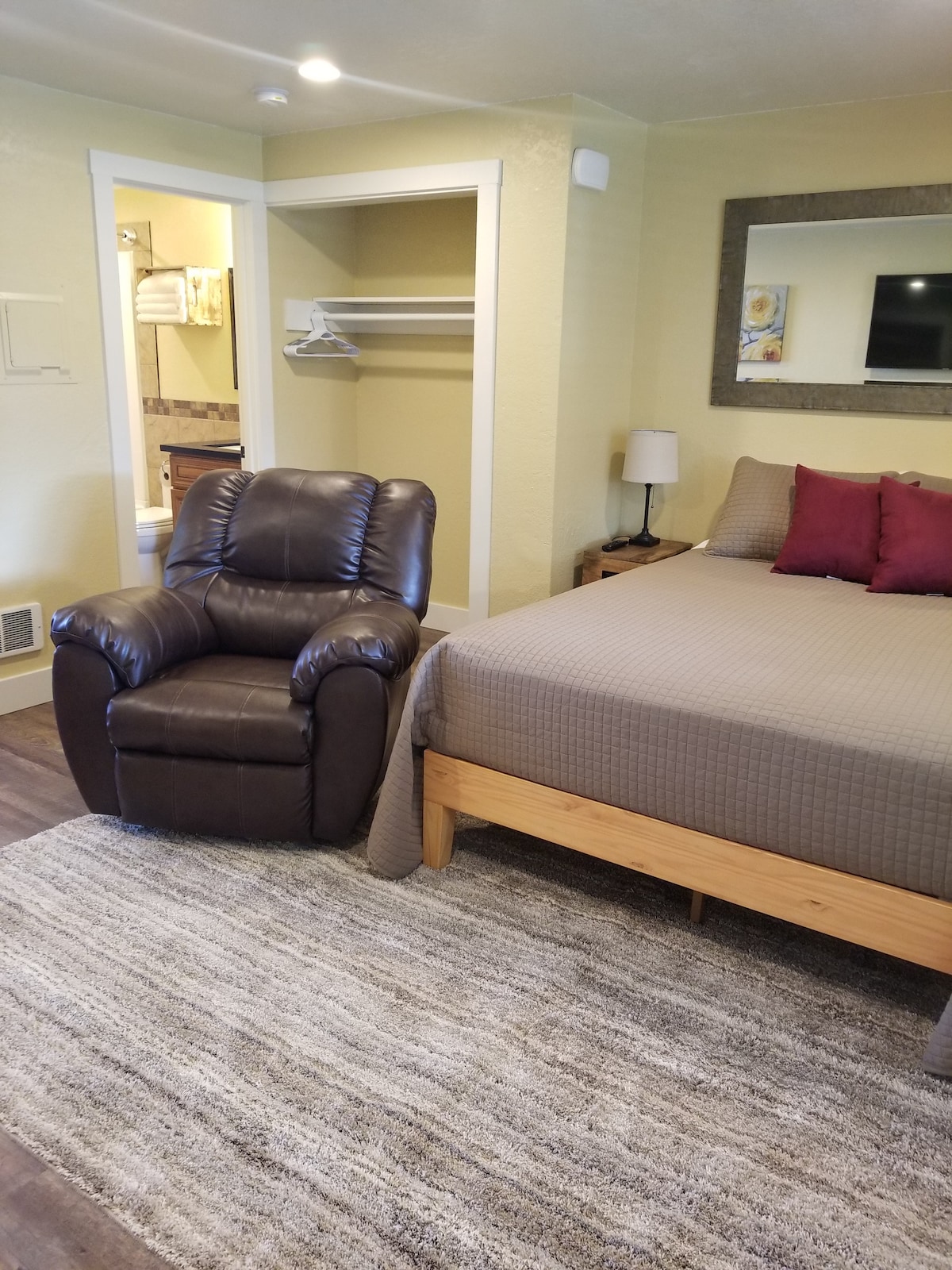 Bez obzira na to da li putujete pacifičkom obalom, dolazite da posjetite dijete u koledžu zajednice Southwestern Oregon ili poslovno, ovo je odlično mjesto za 1-2 osobe. Studio se nalazi u rezidencijalnom području u blizini autoputa i prodavnica Kejp Arago. Privatni, novouređeni, super čisti, udobni bračni krevet, potpuno opremljena kuhinja, 55"Smart TV sa ravnim ekranom, kupatilo. Ova garsonjera je na drugom spratu i gosti bi morali da se popnu stepenicama da bi došli do nje.