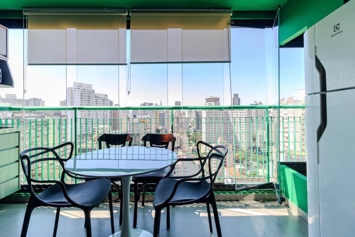 Vaš super kul apartman na 18. spratu, okrenut ka Praça da República! Neverovatan pogled na SP koji će vas inspirisati tokom dana. Uživajte u balkonu, klima-uređaju i osnovnoj kuhinji. U zgradi, potpuno opuštanje: krovni bazen (25. sprat!), fitnes centar, vešernica, mini market, igraonica i parking. Blizu svega, doživite grad sa sjajnim stilom i udobnošću. Savršeno za one koji traže autentično i živopisno iskustvo.