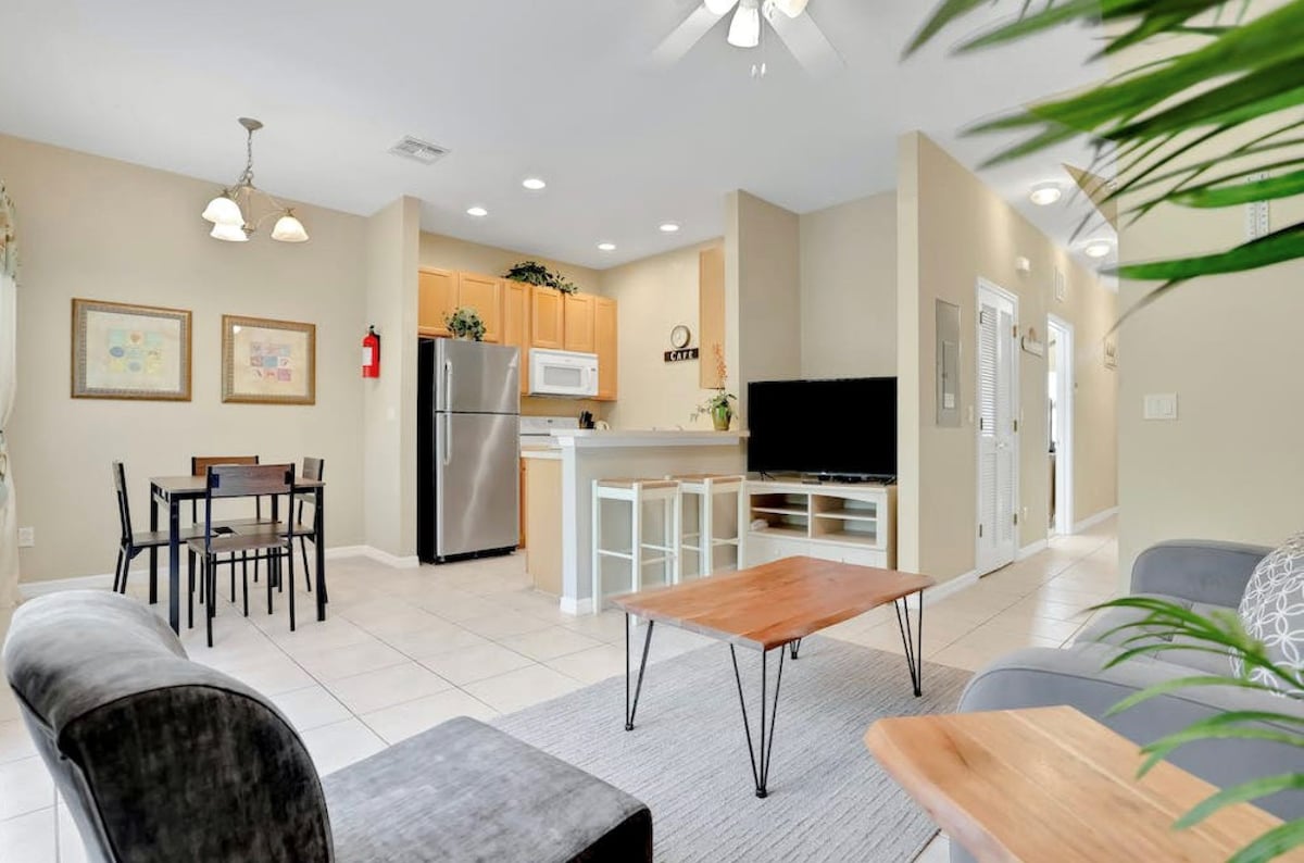 Vaša porodica će biti blizu jednog od najčarobnijih mesta Diznilend ! Obližnje opcije zabave i hrane su beskrajne. Ovaj novouređeni gradski dom se nalazi u zajednici u stilu odmarališta sa novouređenom klupskom kućom i bazenom. Ovo odmaralište u nizu udaljeno je 9 milja od tematskog parka Epcot i Diznijevih holivudskih studija i 20 milja od međunarodnog aerodroma Orlando.